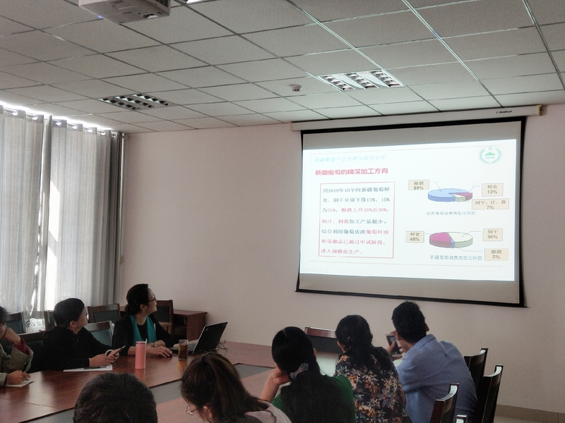根据新疆“十三五”重大科技专项新疆特色酒庄葡萄酒创新工程——新疆特色酒庄葡萄酒质量安全控制技术研究项目,张谦研究员就“新疆葡萄产业的发展与现状”开始讲起,详细的为在场的师生讲解了新疆葡萄的种植面积及产量,分析了新疆葡萄的优势及特点,介绍了新疆葡萄的精深加工方向,重点讲解了在新疆葡萄制干加工现状、加工生产线以及新疆葡萄酒产业现状。