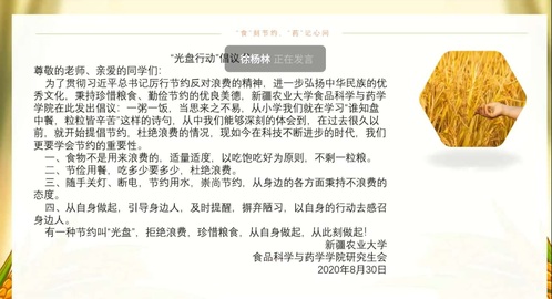 为了响应习近平总书记的号召,倡导节约之风,杜绝“舌尖上的浪费”,8月30日,赌博网站 通过钉钉会议方式组织全体研究生开展了以“食刻节约,药记心间”为主题的班会。