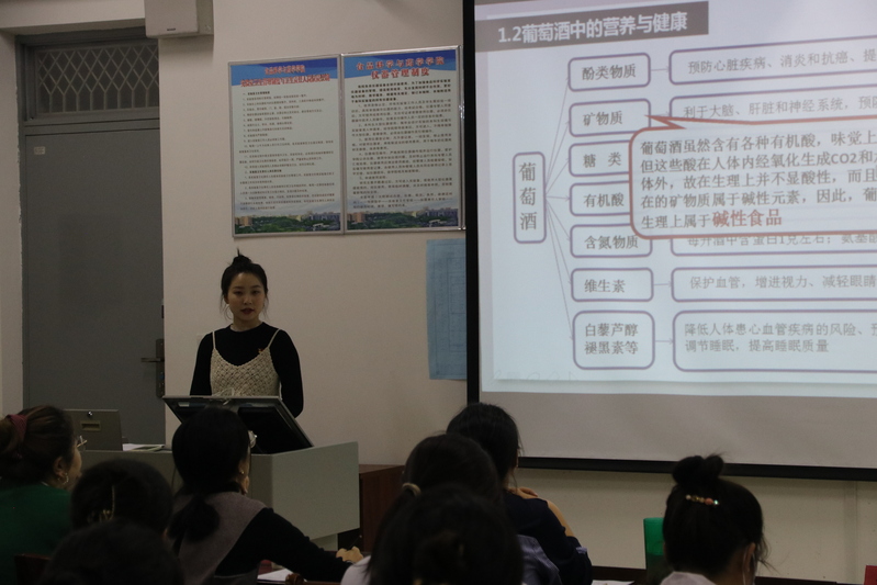 主持人对本次比赛的评分规则讲解后,比赛正式开始。参赛者以葡萄酒酿造及葡萄酒品鉴、食品中毒、健康饮食、分光光度法在食品安全检测中的应用、食品的谣言等内容为题材,通过PPT汇报、视频展示等形式,为在场同学科普了食品科学知识,其中19级研究生刘晓燕宣讲的“小葡萄的历险记”引起了同学们的广泛兴趣,她用动画的形式向大家讲述了葡萄的采摘、酿造、包装过程,科普了葡萄酒的品鉴方法;20级研究生张文乐向同学们科普了“海姆立克急救法”的使用方法,现场互动加大了同学们的参与感,取得了较好的宣讲效果。