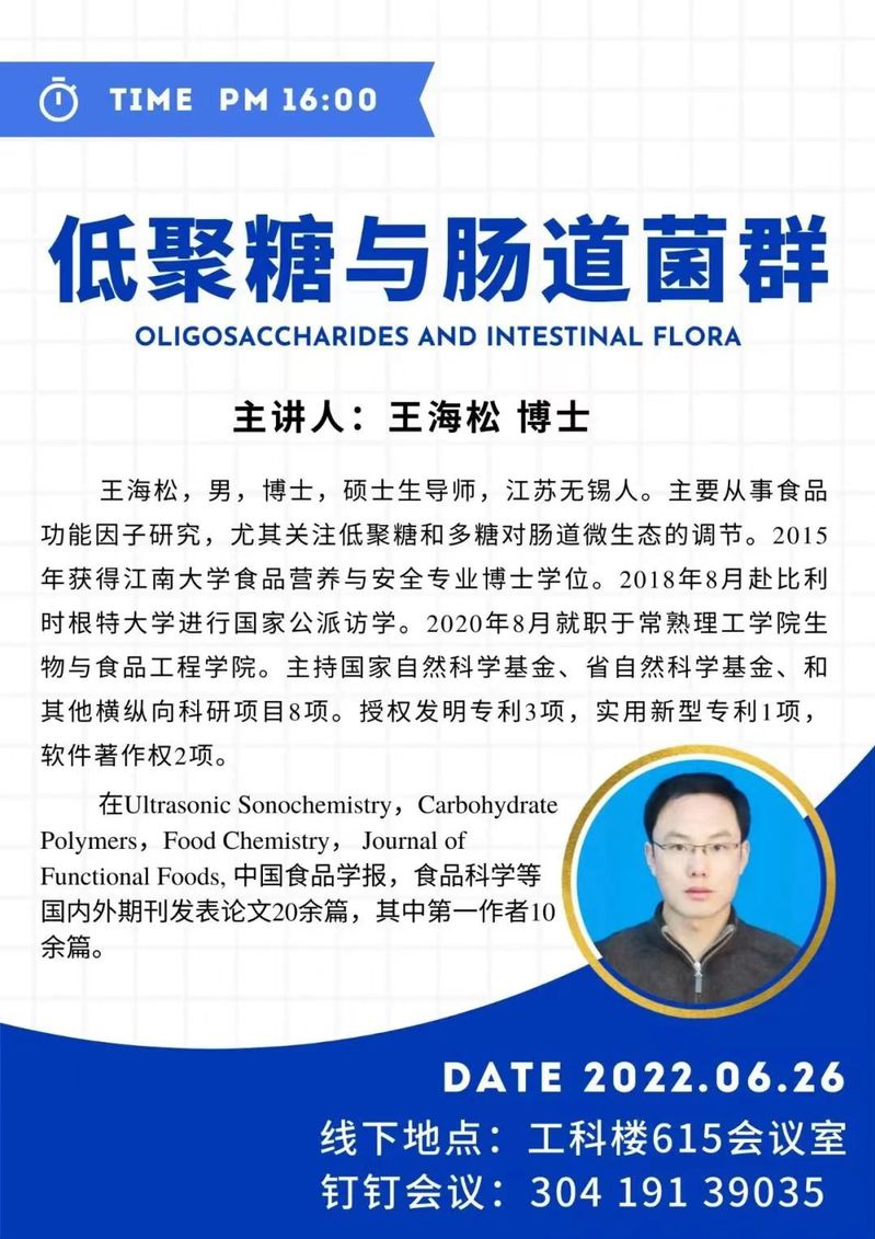 为进一步提升学科专业建设水平,拓宽学术视野,扩大学术交流,促进学科建设高质量、内涵式发展,赌博网站 特别邀请了常熟理工赌博网站 的王海松博士为大家开展低聚糖与肠道菌群的相关专题讲座,本次讲座的主讲老师在科研上经验丰富,成果丰硕,欢迎各位研究生入会学习。