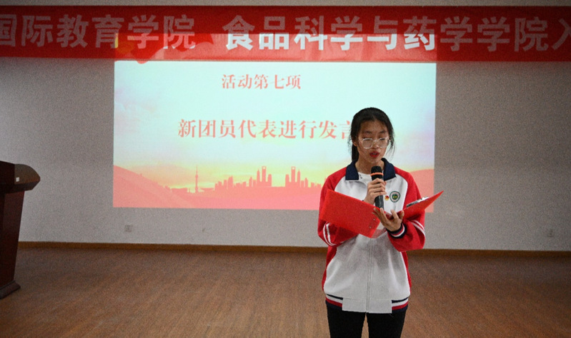伴随着雄壮而庄严的国歌,入团仪式正式拉开了帷幕。吴天宇老师对入团仪式进行致辞,她提到,共青团员肩负着重大的历史使命。在未来的社会,需要千千万万个有理想、敢担当、能吃苦、肯奋斗的新时代青年。共青团员应当是有志青年,要树立崇高的信念,奋发进取,严格要求自己,履行好一名团员的责任和义务。