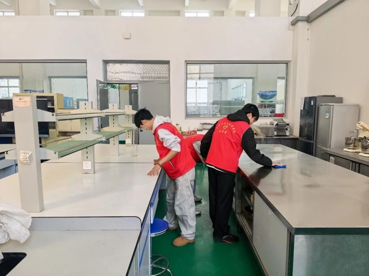 清扫过程中,志愿者们仔细擦拭实验设备,细心清扫地面,认真擦拭门窗玻璃,有序整理各类物品,将废弃杂物分类清理、统一搬运。大家不怕脏、不怕累,不放过任何一处卫生死角,用认真细致的态度守护着实训环境。